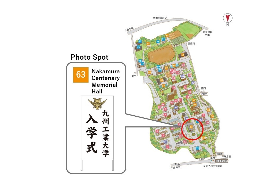 On the day of the Commencement Ceremony, we will place Commemorative Commencement Ceremony Signs at four locations: two at the north entrance and two at the south entrance of Nakamura Centenary Memorial Hall, Tobata Campus, Kyushu Institute of Technology (Building No. 63).
