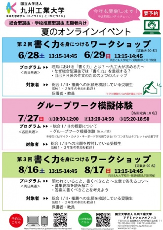 九州工業大学では、総合型選抜等への出願を検討している高校生?高卒生、保護者の皆さま、高等必博官网?中等教育必博官网などの担任?進路指導ご担当の方々を対象に、「書く力を身につけるワークショップ」を開催します。