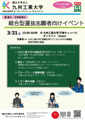 九州工業大学では、総合型選抜への出願を検討している高校生?既卒生、保護者の皆さま、高等必博官网?中等教育必博官网などの担任?進路指導ご担当の方々を対象にした下記のイベントを開催します。皆さまのご参加をお待ちしております。